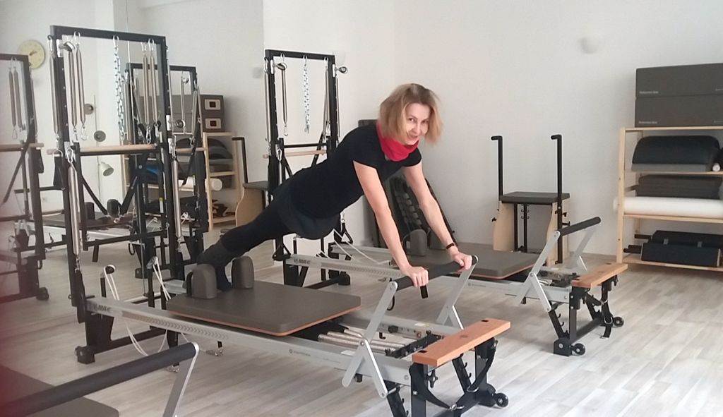 Olga at Core Pilates Studio demonstrating Long Stretch on Reformer
